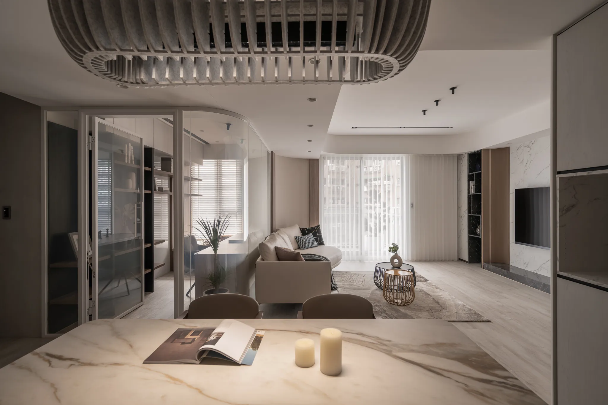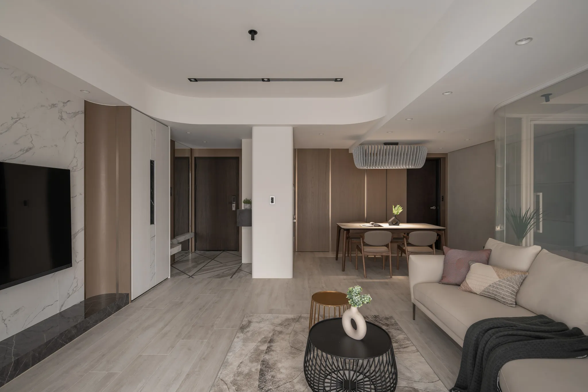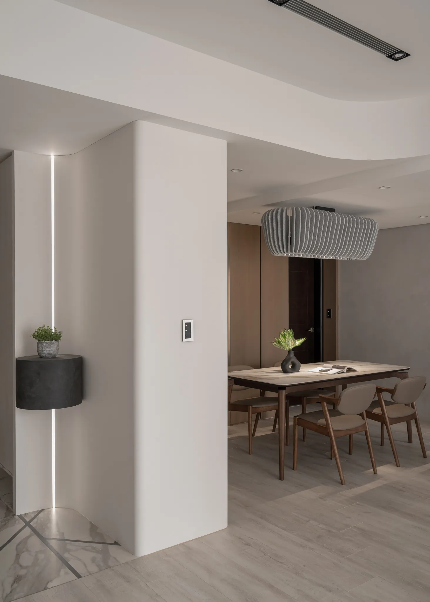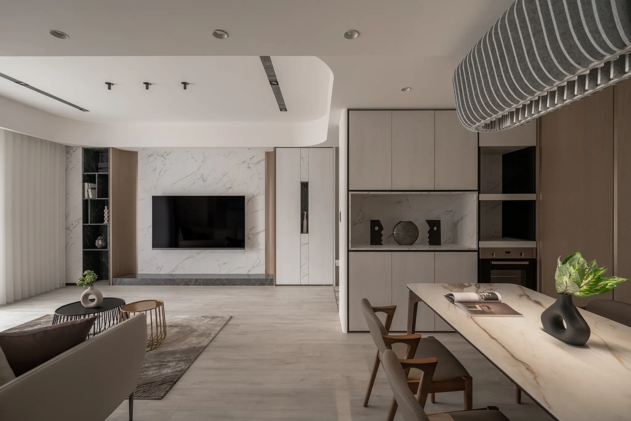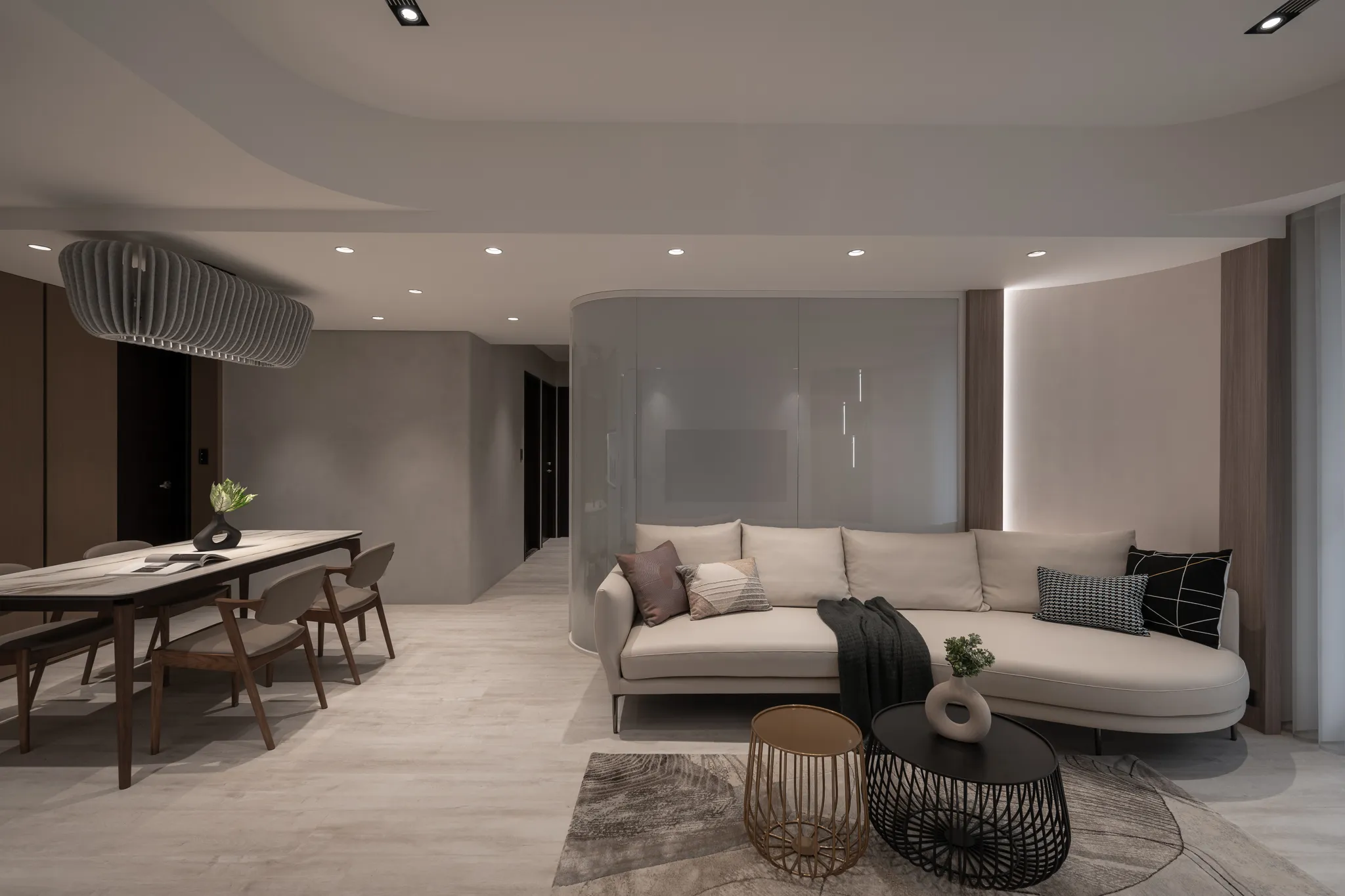 「Urban Curve」的設計回答了這個提問。它運用曲線去擁抱人的步伐。玄關處,一道傾角的弧牆體貼地提醒——從此刻開始,你可以不必跟隨外界的急促節拍。光線經過曲面折射散成細緻的柔光,把緊繃的心緒輕輕安撫。